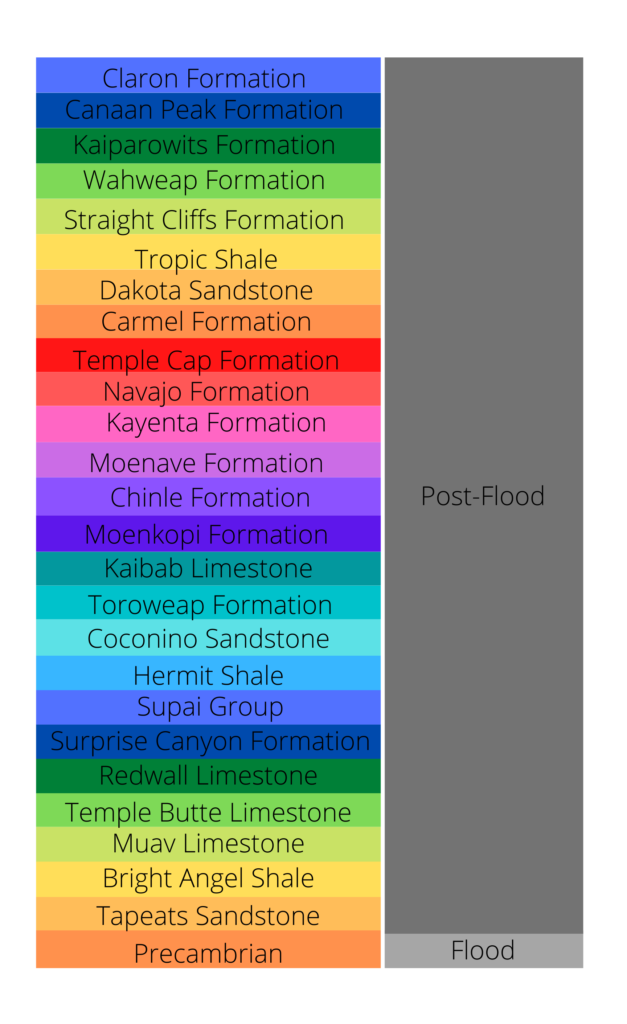 The primary difference between this model and the former concerns the Cenozoic. According to this model, the Flood’s contribution is that of the Paleozoic and Mesozoic rocks. Meanwhile the Cenozoic formed after the Flood. Advocates of this model point out that there is a trend from large-scale Flood layers of the Kaiparowits Formation to the post-Flood layers of the Canaan Peaks Formation, which were largely formed in basins. The Canaan Peaks Formation and Claron Formation represent deposits formed in post-Flood lakes. There was much geologic activity after the Flood in this region. Large-scale natural disasters that were still at play in the decades or centuries after the Flood further reshaped the region. Following this was a brief Ice Age lasting for hundreds of years.