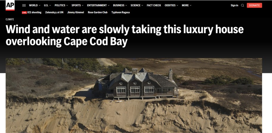 Headline from the Associated Press warns about erosion eating away at Cape Cod cliffs.