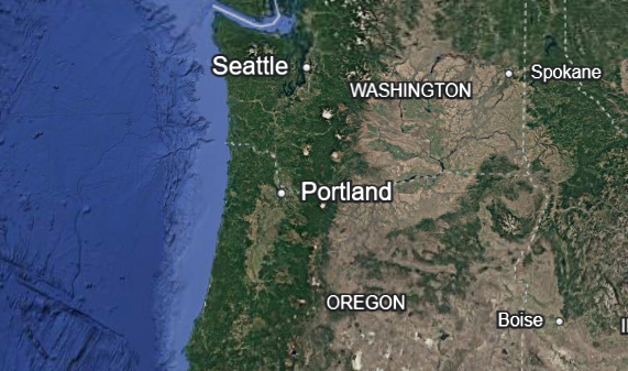 Take another look at the picture of Southern New England above. The light blue color shows how far the North American continent extends into the ocean. Then, it reaches a sea shelf and drops off suddenly. The edge of the light blue is where erosion must have begun, and the Atlantic ocean has eroded away at the land until its current state. The west coast has much less evidence of erosion. Compare the photo of the Northeast to this photo of the West coast. The light blue color does not extend nearly as far west, meaning much less erosion has occurred in the west coast. We can attribute this difference to several factors, such as more tectonic activity in the west (earthquakes push the sea back) and the mountain ranges in the northwest being more resistant to erosion than the softer sediments in the east.