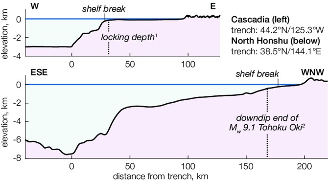 A graph showing the two-step cycle of erosion followed by the continent rising to push the coastline back. Image credit: Malatesta, Luca & Bruhat, Lucile & Finnegan, Noah. (2018). Co-location of the downdip end of seismic locking and the continental shelf break. 10.31223/osf.io/uwzbr.
