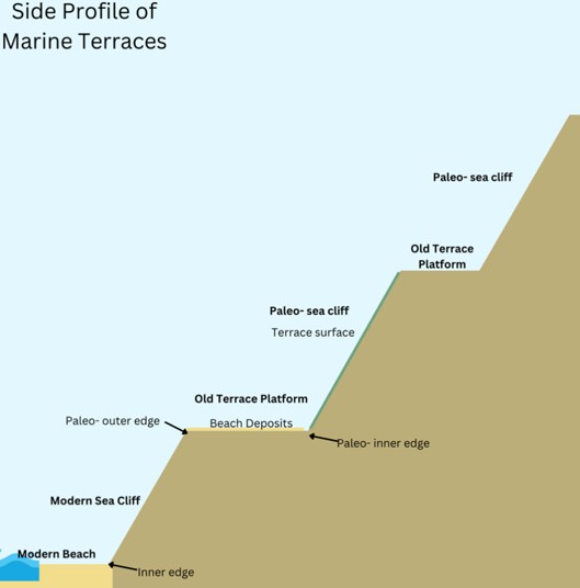 This cycle of continental uplift forms a geological formation called a marine terrace. Essentially, when the continent lifts and then erodes and then lifts again, the coast becomes a series of steps. On the west coast, several of these terraces can be found, showing evidence of hundreds of thousands of years of cyclical erosion and drops in sea level. Does this solve the problem of coastal erosion for deep time?