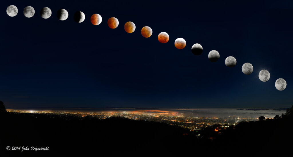 This photo sequence is from a total lunar eclipse in October of 2014. A lunar eclipse occurs when the Moon slips into the shadow cast by the Earth. Like all good eclipses, a lunar eclipse starts with the partial phase. During this phase, an ever-increasing portion of the moon’s surface is enveloped in the Earth’s shadow. The contrast between the shadowed and unshadowed regions on the moon is so stark, that it looks like the moon is being eaten away, a giant cosmic cookie being devoured by tiny ants. Once the moon is entirely within the earth’s shadow, however, the contrast goes away, allowing you to see the actual shade of Earth’s shadow on the moon’s surface. The reddish color you see is the sunlight reaching through the upper layers of Earth’s atmosphere and striking the moon’s surface. It’s red for the same reason that sunsets are red; the blue wavelengths of sunlight are scattered as the light travels through the atmosphere at a steep angle. After an hour or two, the moon begins to slip out of this shadow, going into a partial phase again, before returning to its unsullied brightness a few hours after the onset of the eclipse.