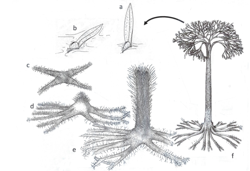 Lepidodendron and other lycopods started out as tiny, seed-like plant parts called propagules. While different from seeds in many ways, they served a very similar function. Each propagule contained one very large female spore (called a megaspore), and it stayed inside a structure called a sporangium. The sporangium attached at a modified leaf called a sporophyll. The whole thing lands on water and disperses by wind like a tiny sailboat. Unlike true seeds, these propagules were designed to be dispersed, fertilized, and grow while floating in the water. To distinguish them from real seeds, scientists often refer to them as “aquacarps.” Some lycopods produced smaller megaspores that released individually. These would fall onto the floating roots of larger plants or the tangled mat upon which the forest floated. Here, they would find fertilization and start growing as part of the floating vegetation. This reproductive cycle does not work in a land-based swamp, but is best explained as occurring in open bodies of water. As lycopods grew from aquacarp to full-grown tree, they quickly developed a root system that spread out like a starfish in the air. It floated around until its roots grew long enough and possessed enough rootlets to entangle with the root systems of other lycopods.