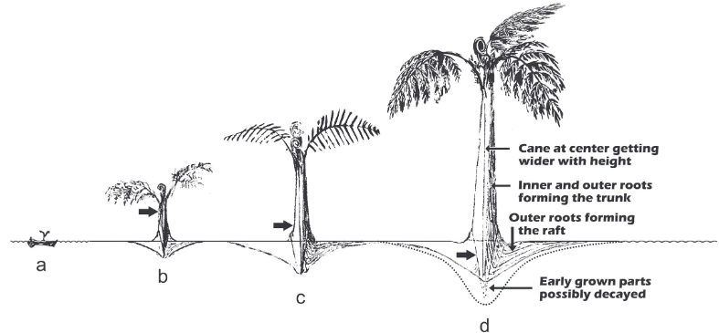 As the tree fern grew, the diameter of Psaronius’ stem gradually increased, and the leaves in the crown became more and more numerous. The entangled roots at the base of the plants continued to increase in thickness to better keep it upright. In response, the heavier the trunk got, the more it forced the tree fern downward into whatever substrate it grew in. This observation works better if the plant is floating on the water rather than in soil.