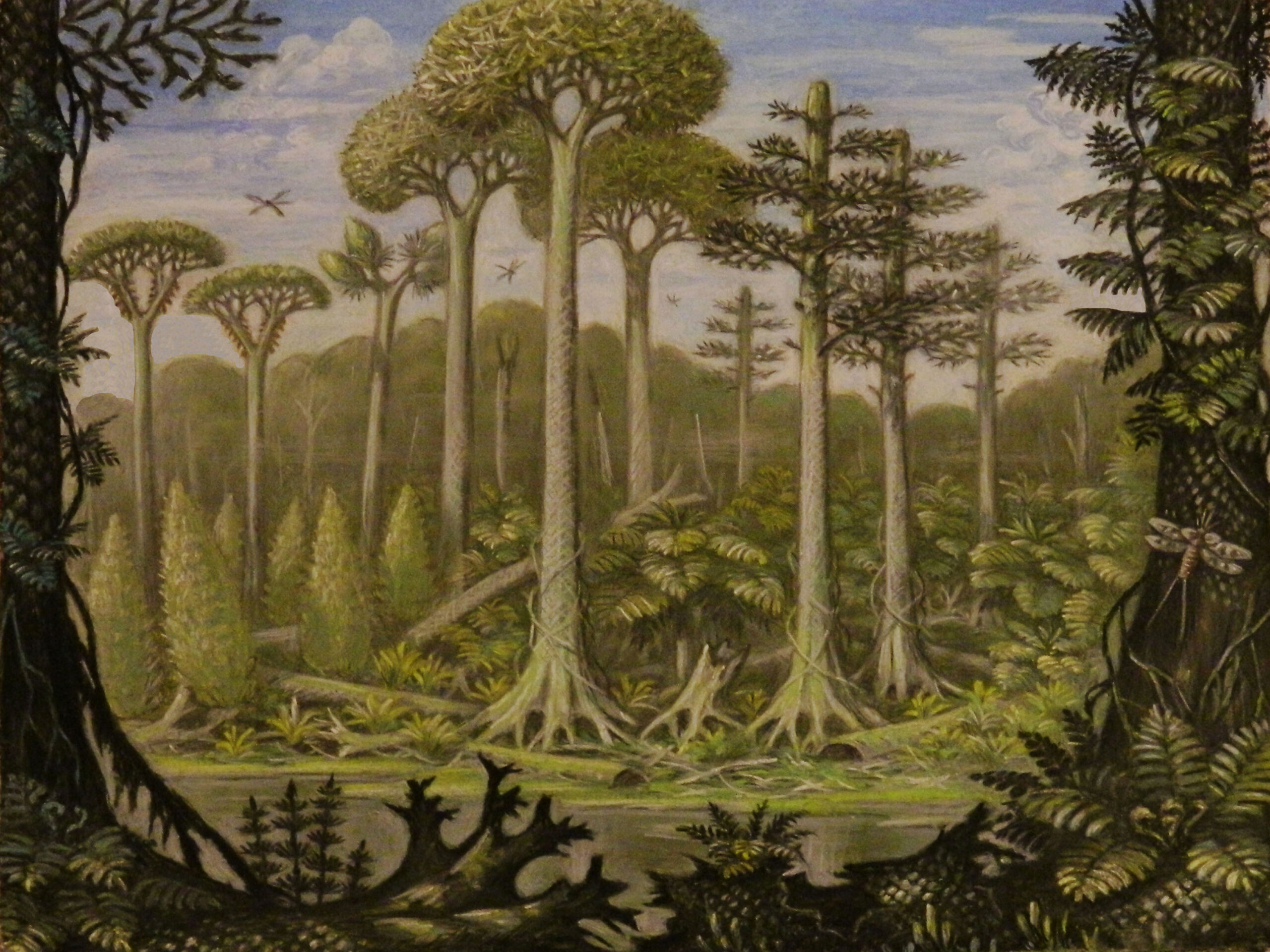 Dr. Wise suggests that the forest consisted of an ecological succession of plants that steadily increased in size closer to the forest’s center. Small, more water-dependent plants made up the edges of the forest. Meanwhile, at the center a full forest biome formed, rooted in a thick mat of vegetation and soil. Dominating the forest were tree ferns like Psaronius, and truly enormous lycopods such as Lepidodendron.